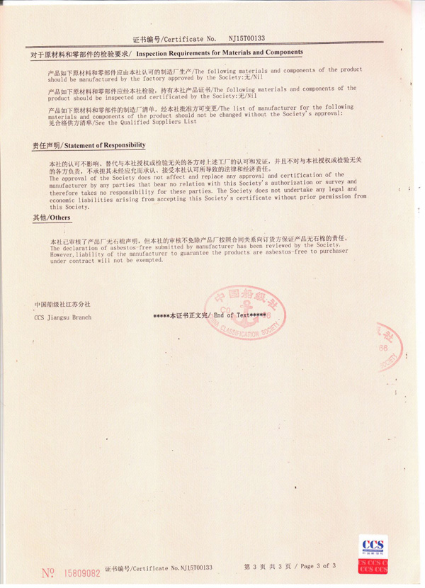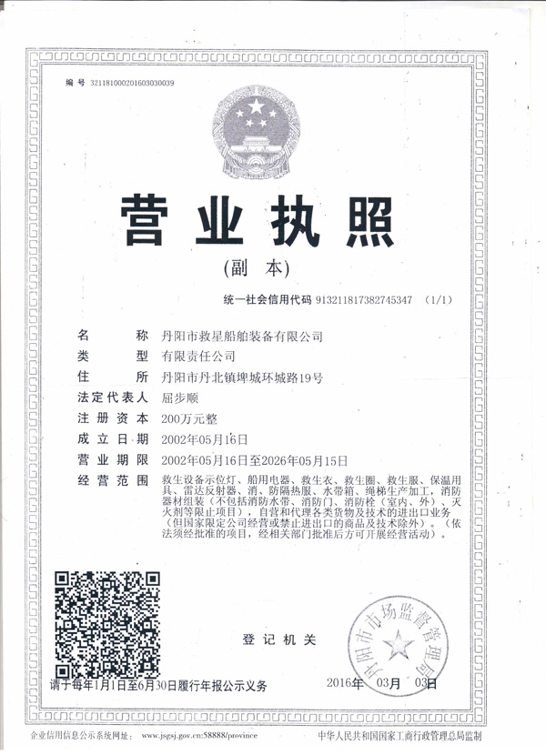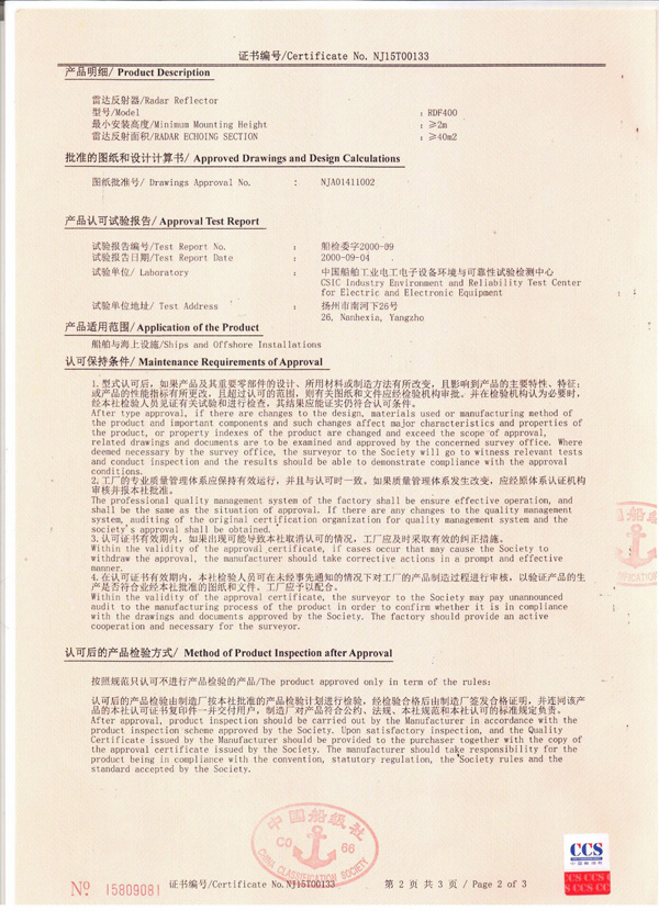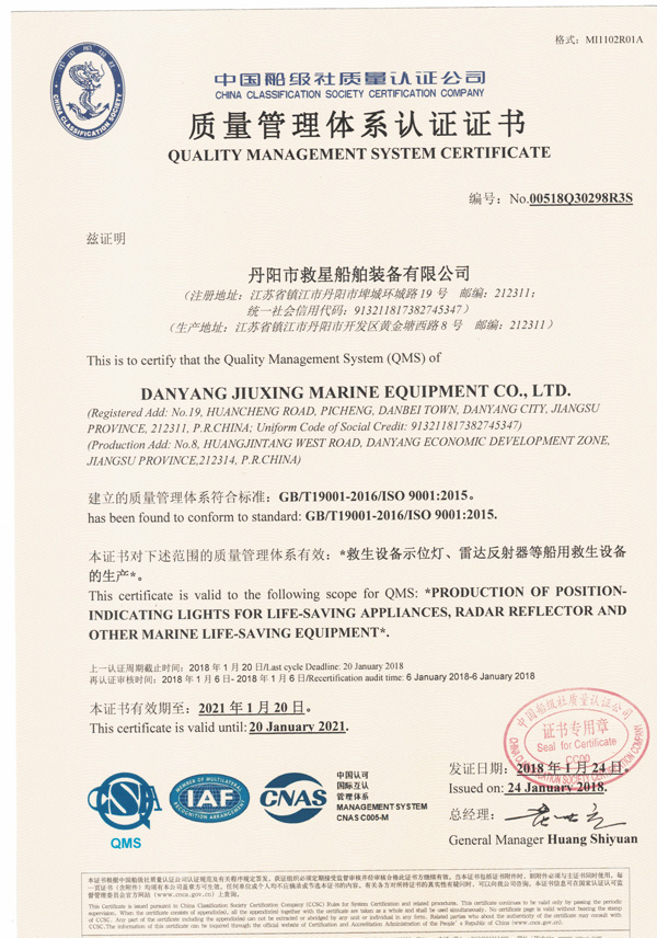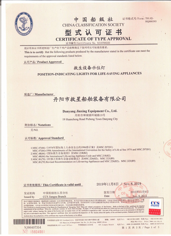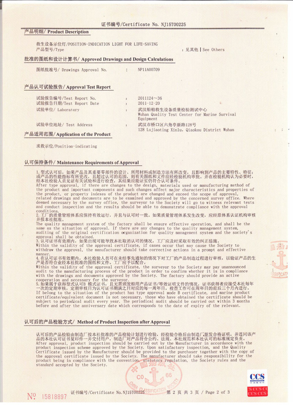 丹陽市救星船舶裝備有限公司為丹陽市船舶救生照明設(shè)備廠子公司,主要生產(chǎn)救生設(shè)備示位燈、雷達反射器、引航員軟梯、登乘梯等產(chǎn)品。其中救生設(shè)備示位燈采用國際上最先進的科學(xué)技術(shù)、生產(chǎn)工藝,優(yōu)質(zhì)材料制造,各項技術(shù)指標(biāo)超過國際先進水平,完全滿足國際最新標(biāo)準(zhǔn)。2012年元月取得“CCS”型式認可證書,并具有歐共體“EC”證書。另外本公司制造的RDF400雷達反射器還獲得了實用新型專利。
